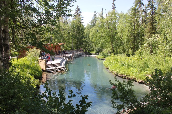 As much as we enjoyed Sol Duc, the Liard Hot Springs were great too. The trail to get to the springs is a board walk through the marsh. The pool nearest the springs is hotter – the temperature of the water is 130 at the source. The pool is clear, with black rocks on the bottom. It really feels good on your feet. In addition to the bear and bison along the road today, we saw Canadian geese feeding here.